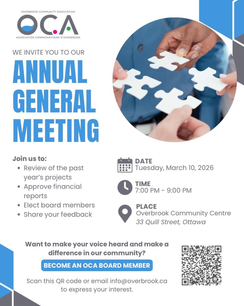 We hope you’ll join us for the Overbrook Community Association Annual General Meeting on Tuesday, March 10, 2026, from 7:00 to 9:00 PM at the Overbrook Community Centre (33 Quill Street).